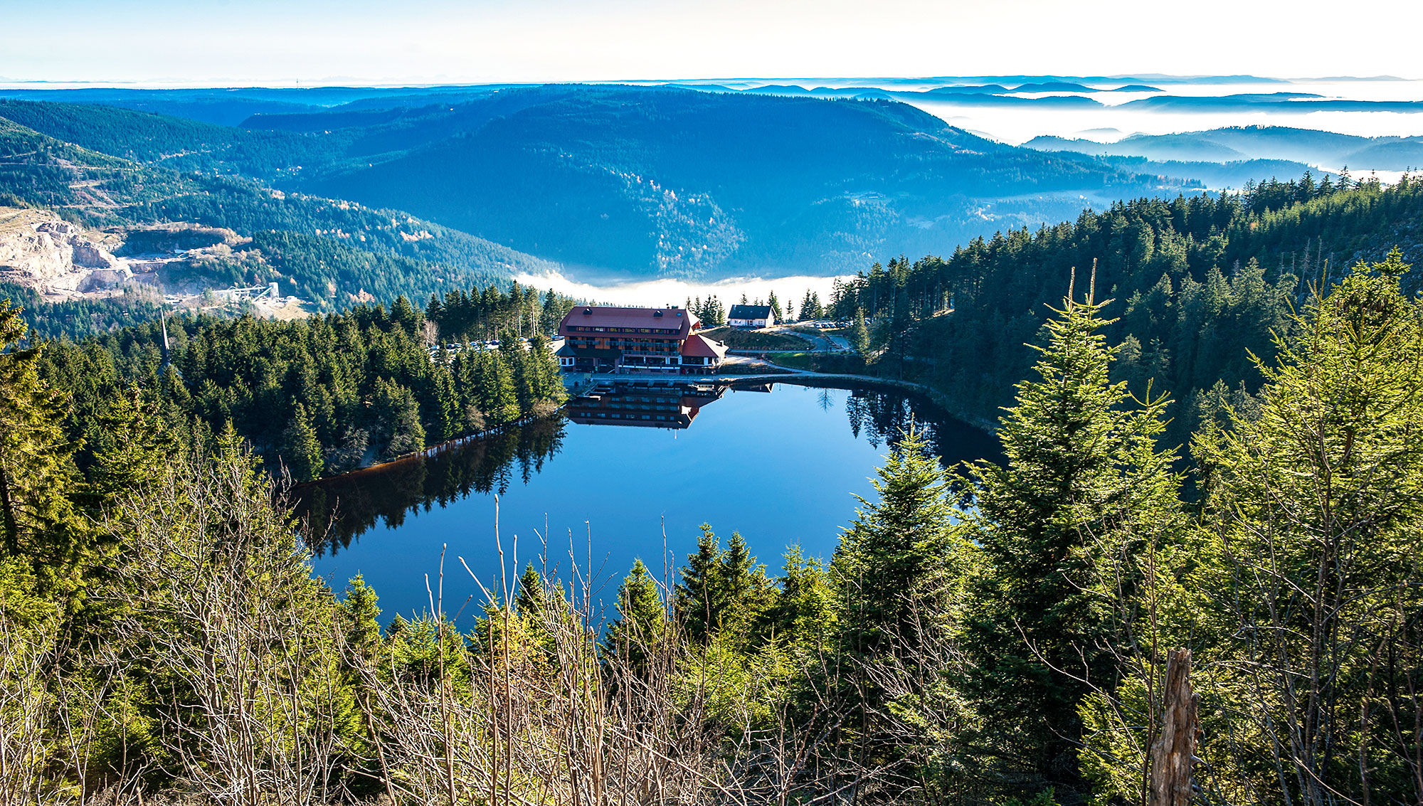 Am Mummelsee, einem sagenumwobenen Karsee an der Schwarzwaldhochstraße, lässt sich gemütlich um den See spazieren, Tretboot fahren oder Schwarzwälder Spezialitäten im Seehotel genießen – ein klassisches Schwarzwald-Erlebnis.